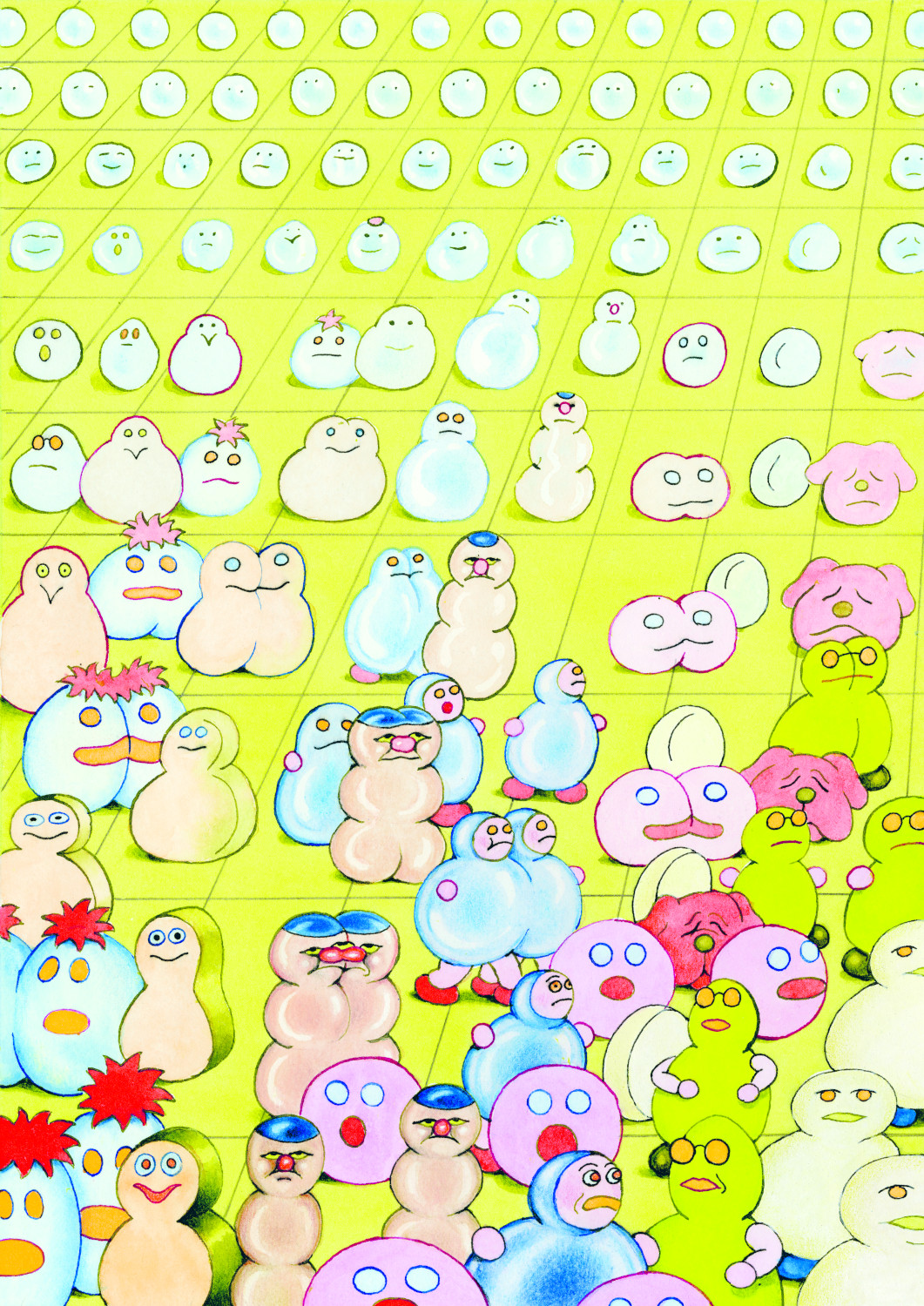 "Samuel Bas seized the very essence of experimental evolution: it is well-rhythmed, with a sensation of unfolding - but also that of the loss of control when everything starts to spiral into an overwhelming diversity of lifestyles coexisting in one and the same tube. The greenish yellow of the background evokes burgeoning life but also the culture medium. This is an unstable, even disturbing colour - just like evolution itself!" (Alexandre Smirnov)